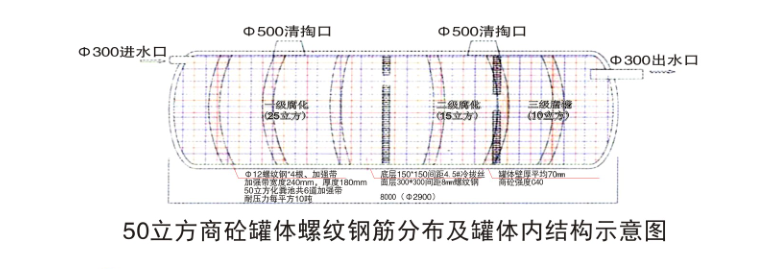 高强度的钢筋混凝土,“钢制内,外模具”,一次性整体成型,罐体内设钢筋